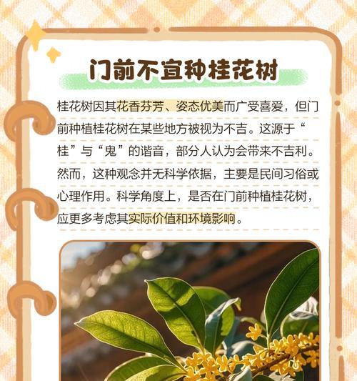 桂花作为一种香气浓郁、美丽迷人的花卉,常常被人们用来装饰家园。然而,在某些传统家庭中,种植桂花却被视为忌讳之事。究竟是什么原因让人们对种桂花如此忌讳呢?接下来,我们将探讨其中的原因。